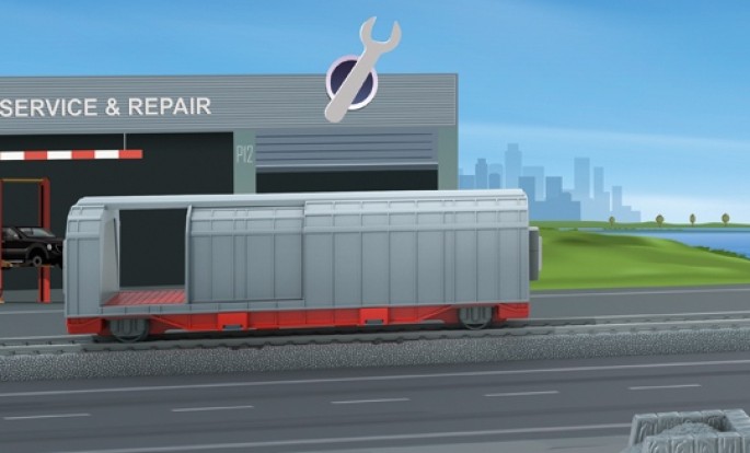 Das Autohaus erwartet freudig die Lieferung der beiden Neuwagen. Der Güterzug mit der kraftvollen Diesellokomotive transportiert die beiden Autos auf dem Autotransportwagen sicher über die Schienen. Natürlich bringt der Zug auch gleich noch andere wichtige Güter mit. Im Schiebewandwagen kommen die neuen Reifen samt Gitterbox gleich mit.