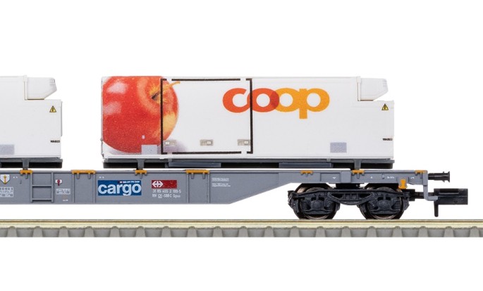 Die Serie der Sgns-Containertragwagen mit Containern des schweizer Coop-Konzerns wird fortgesetzt. Das neue Motiv sind die Äpfel. Außerdem wird erstmalig ein Set mit 6 separaten Containern und ein leerer Wagen angeboten um den Zug beliebig verlängern zu können.