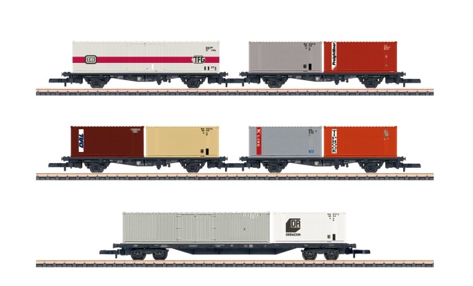 In den 1970er Jahren wurde der Containerverkehr auch auf der Bahn zu einem immer wichtigeren Geschäftsbereich. Während anfänglich noch einzelne Wagen mit Containern zu befördern waren, wurden in 80er-Jahren schon meist Ganzzüge von den innländischen Containerterminals zu den Häfen Hamburg und Bremerhaven einegsetzt. Einen solchen Zug kann man mit diesem Wagenset nachstellen. Das Set ist mit Containern der unterschiedlichsten Reedereien beladen. Auch im Deutsch-Deutschen Warenverkehr wurden Container genutzt. So sind hier zum Beispiel sowohl West- als auch Ostdeutsche Container auf diesem Zug verladen.